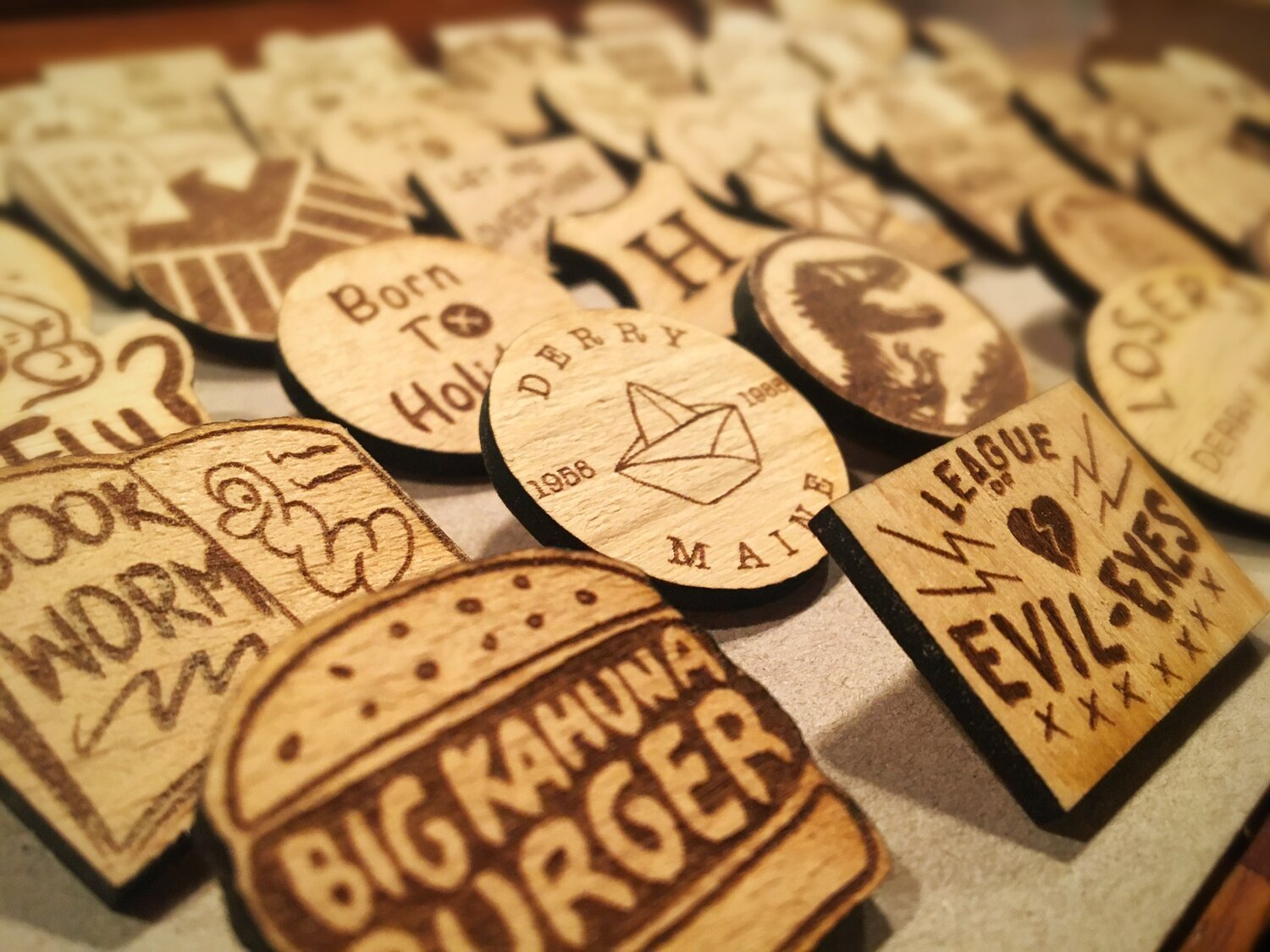 HARTY’S WOODEN THINGS HAND CRAFTED PIN BADGES